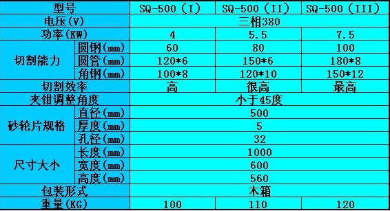 SQ-500型砂輪切割機(jī)分為4KW,5.5KW,7.5KW,其中5.5KW性價比最高,性能穩(wěn)定使用范圍較廣。